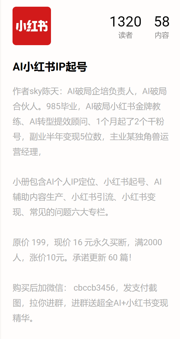 购买后加微信: cbccb3456,发支付截图,拉你进群,进群送超全AI+小红书变现精华。